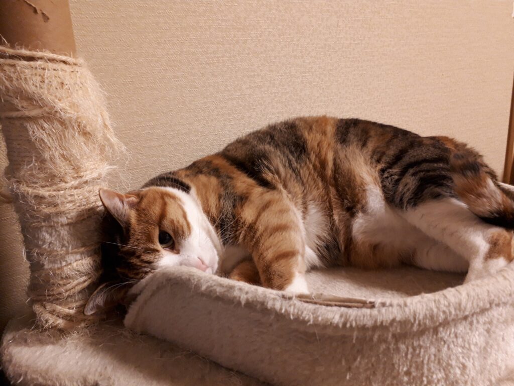〇お気に入りの、猫タワーでごろんするカノン